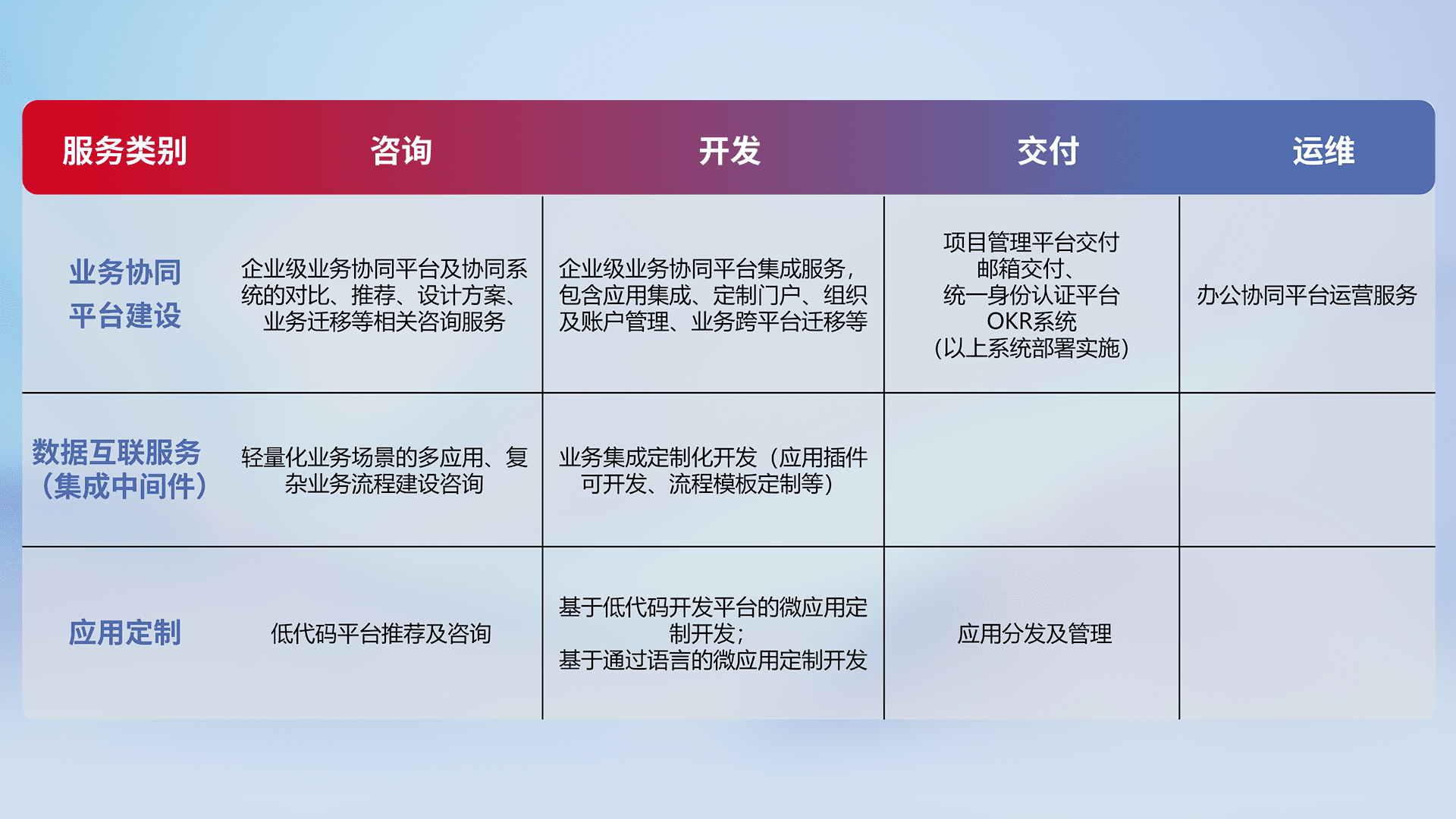 针对钉钉、、、企微、、、IDaas等平台级产品提供产品的规划、、、方案、、交付、、、定制化开发等服务,,,实现如统一协同办公、、、、智能客户服务、、、混合会议管理、、、智能数据查询、、等业务场景,,实现数字化转型。。。